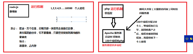 Node.js he used the JavaScript engine, then it is destined to be single-threaded, using asynchronous methods to open multiple tasks, without having to wait for the last task thread like php to use the end of the next use; PHP is also single-threaded but it borrows the Apache server to provide multi-threaded services. PHP is also single-threaded but it borrows the Apache server to provide multi-threaded services. Run mechanism comparison